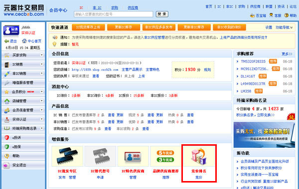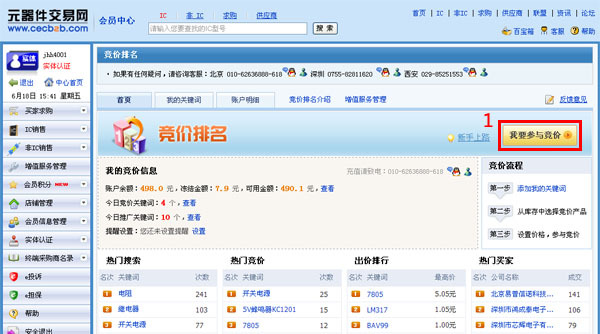 1、開通服務后,登錄會員中心,點擊首頁增值服務“競價”(或左側菜單“增值服務管理”,點擊“我要競價”)進入競價排名首頁。