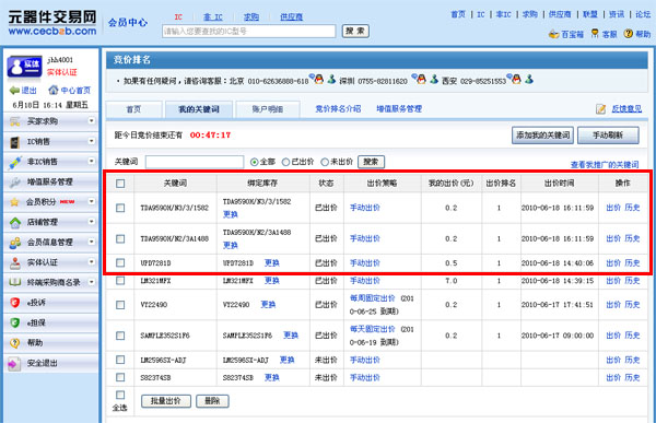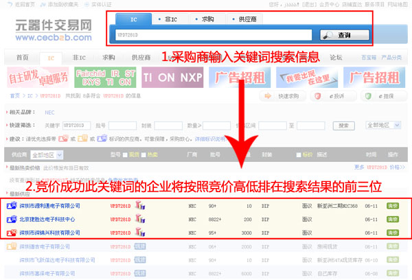 據元器件交易網統計,約80%的采購商在搜索時只查看第一頁展示的信息。因此,如果您參加競價排名,可以: