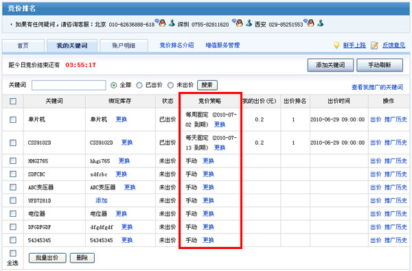 您在“我的關鍵詞頁”及“出價頁”都可以操作,以出價頁為例: